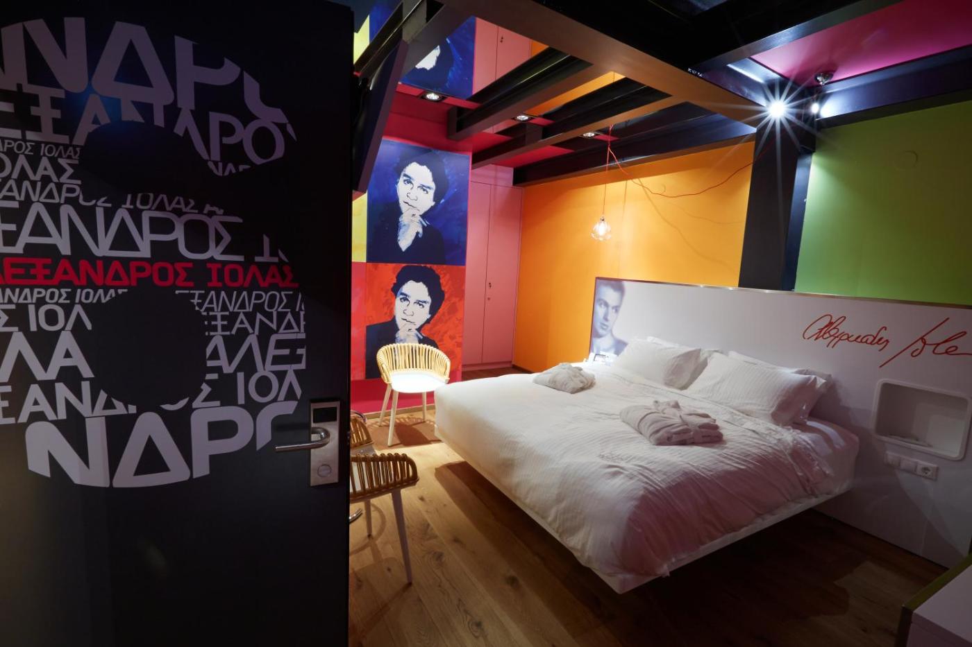Deluxe Double Room. Inspired by Greek filmakers, poets and artists, this air-conditioned room is fitted with modern furnishings, lively colours and parquet floors. It is equipped with a flat-screen satellite TV, a fridge and a safe. The modern bathroom comes with bathrobes, hairdryer and free toiletries. ;